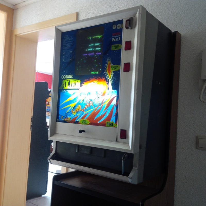 Im Sommer 2015 hatte ich ein Cosmic Alien Wandgerät als defekt in einem bekannten Auktionshaus ersteigert.Einige technische Sachen mussten überarbeitet werden. So waren zum Beispiel Kontakte verschmutzt, und die Platine war defekt.Nach der Abholung des Gerätes machte ich mich gleich am nächsten Tag dran, und baute die Platine aus.