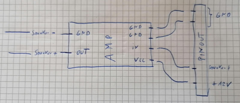 Zuerst mal musste ich einen Anschlussadapter bauen. Ein Blick in die Piniouts verriet dass das Board einen externen Verstärker braucht. Diesen kann man