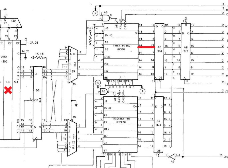 Nun ist der Fehler eingekreist. Es ist also der A8 (SN74LS374N) oder der Baustein E6 (TMS4164-20NLJ).