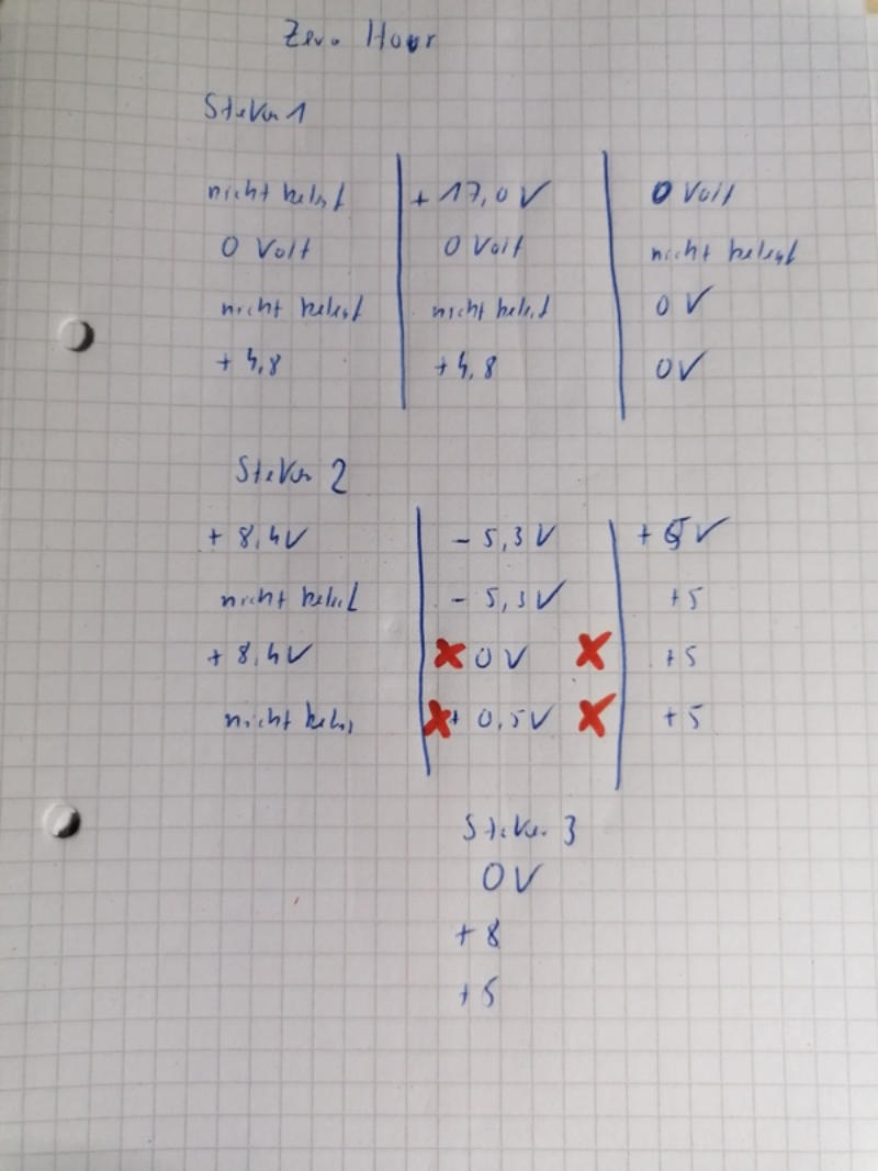 Bei den beiden Kreuzchen war der Fehler. Hier sollten so um die 9 Volt anliegen.