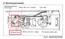 Hier fehlten die Lämpchen für den 1 bzw 2 Player Schriftzug. Der Vorgänger hatte diese ausgebaut und die Kabel für den Joystick (oben / unten) benutzt.