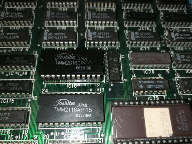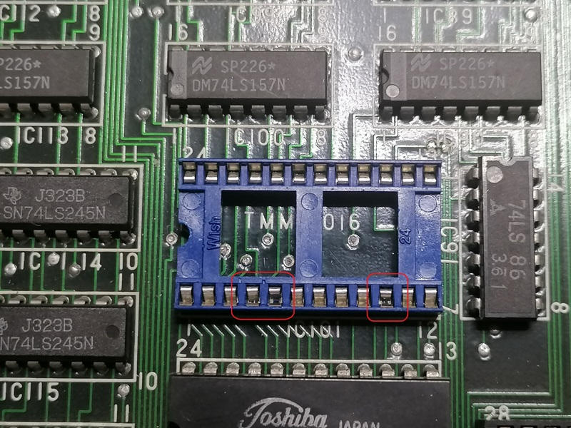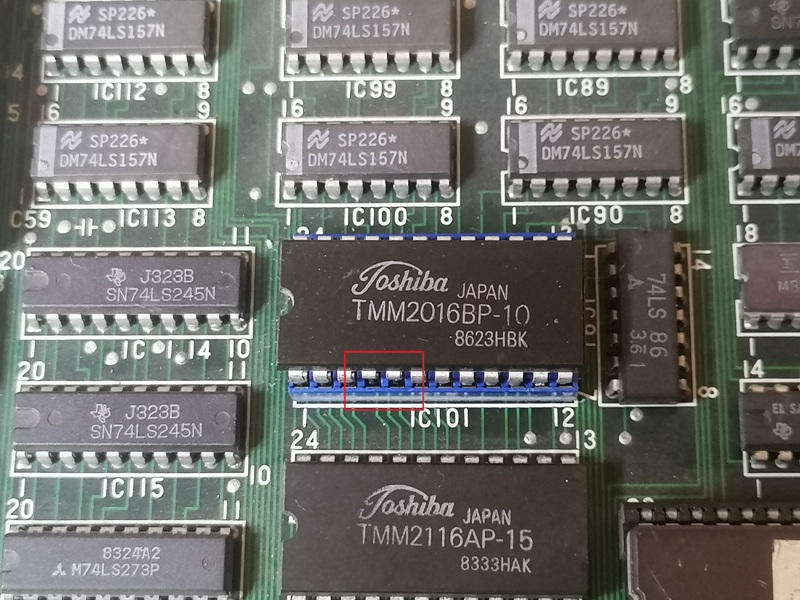 Um den Fehler zu finden hatte ich die Eproms abgeklopft und an den Pins leicht mit der spitze des Ozis gedrückt.Reagiert hatte die Grafik dann beim Toshiba RAM TMM2016BP-10. Wenn man genauer hinschaut sieht man auch das im Sockel die Kontakte verbogen sind. Dieser Sockel wurde vermutlich schonmal vom Vorgänger getauscht.